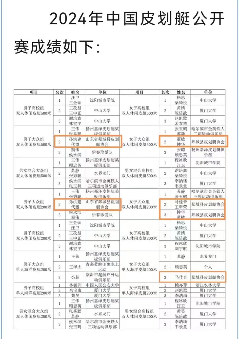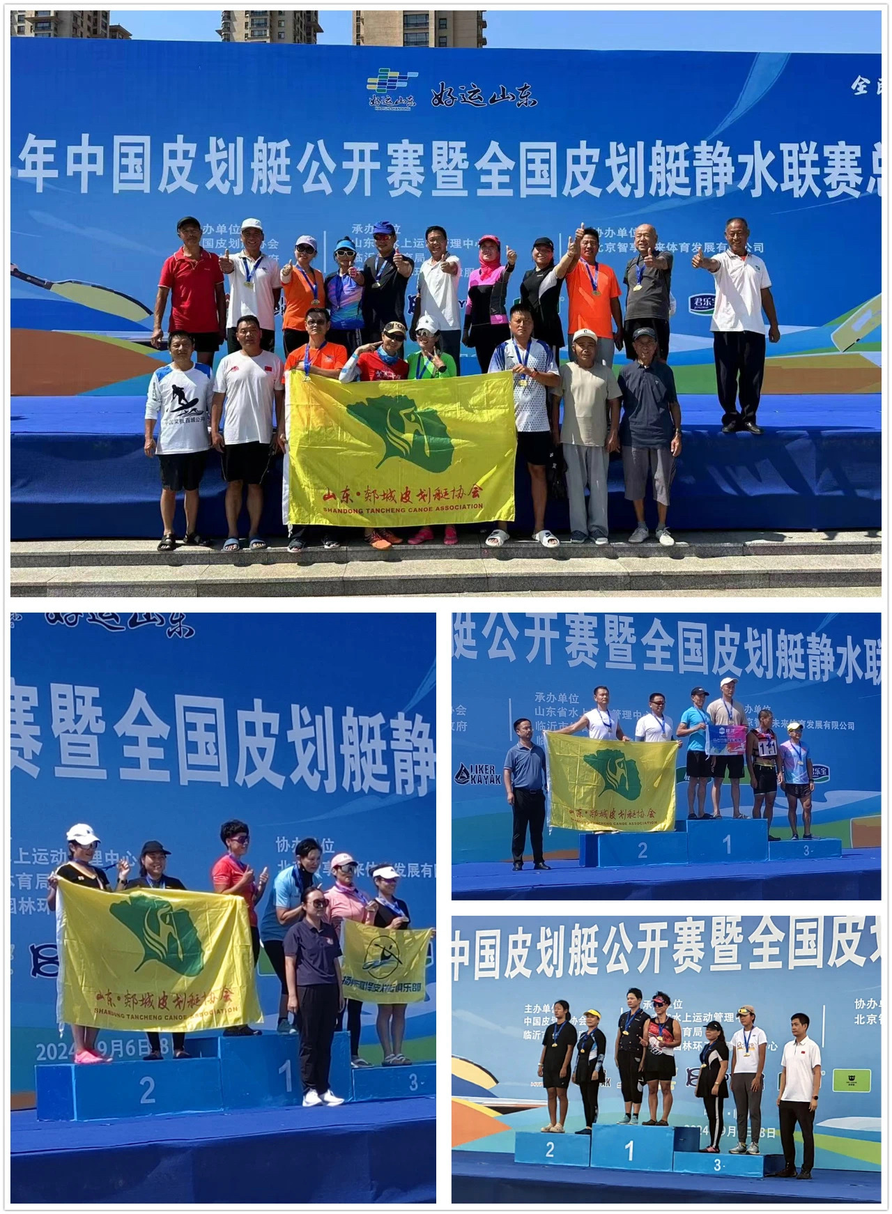 9月7日至8日,经过两天的鏖战,2024年中国皮划艇公开赛暨2024年全国皮划艇静水联赛(总决赛)在临沂沂河风帆广场落下帷幕。本次比赛汇集了来自北京、天津、广东、江苏、浙江、黑龙江、辽宁、山西、山东等十余个省市的专业代表队和皮划艇爱好者以及来自中国人民公安大学、厦门大学、中山大学等十余所知名高校的大学生,累计300多名选手,齐聚沂河,劈波斩浪,力争名次,角逐奖牌。郯城县皮划艇协会共派出20名选手参加了本次大赛,他们在装备落后的情况下,不畏强手,奋勇拼搏,最终夺得大众组4枚银牌、2枚铜牌。成绩如下: