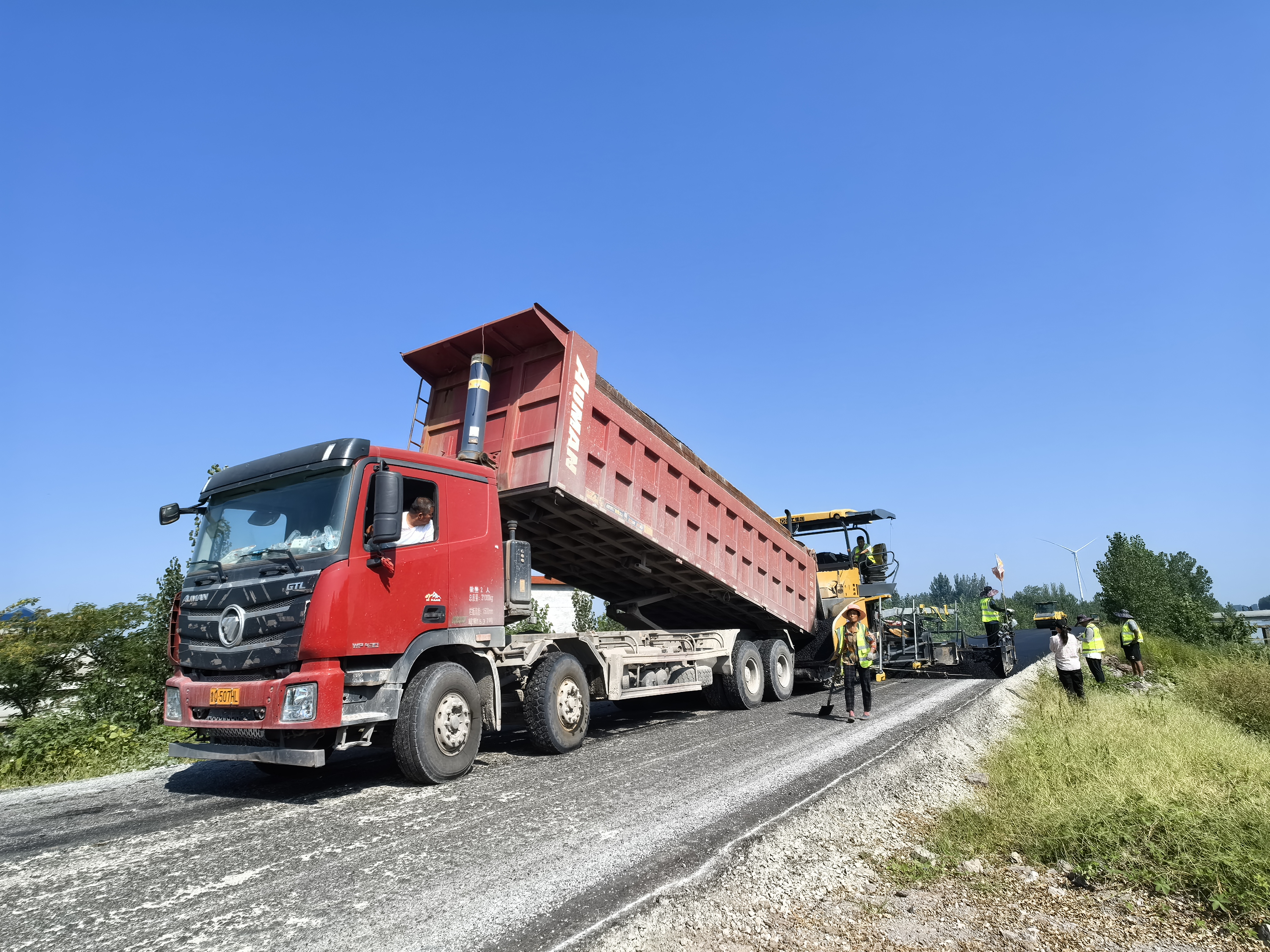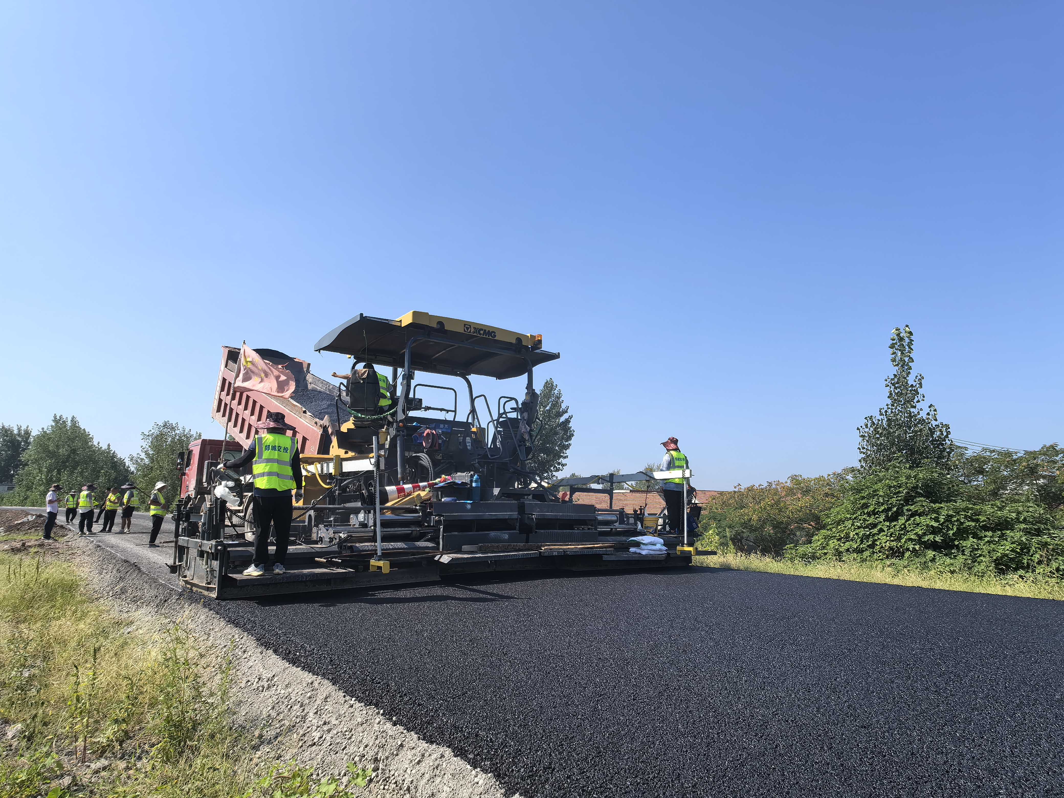 在泉源镇新白马河右岸,运输车、摊铺机、压路机正在加紧进行路面摊铺。多名施工人员“全副武装”,手拿铁锨等工具,对局部机械施工不到位的地方再进行修整。