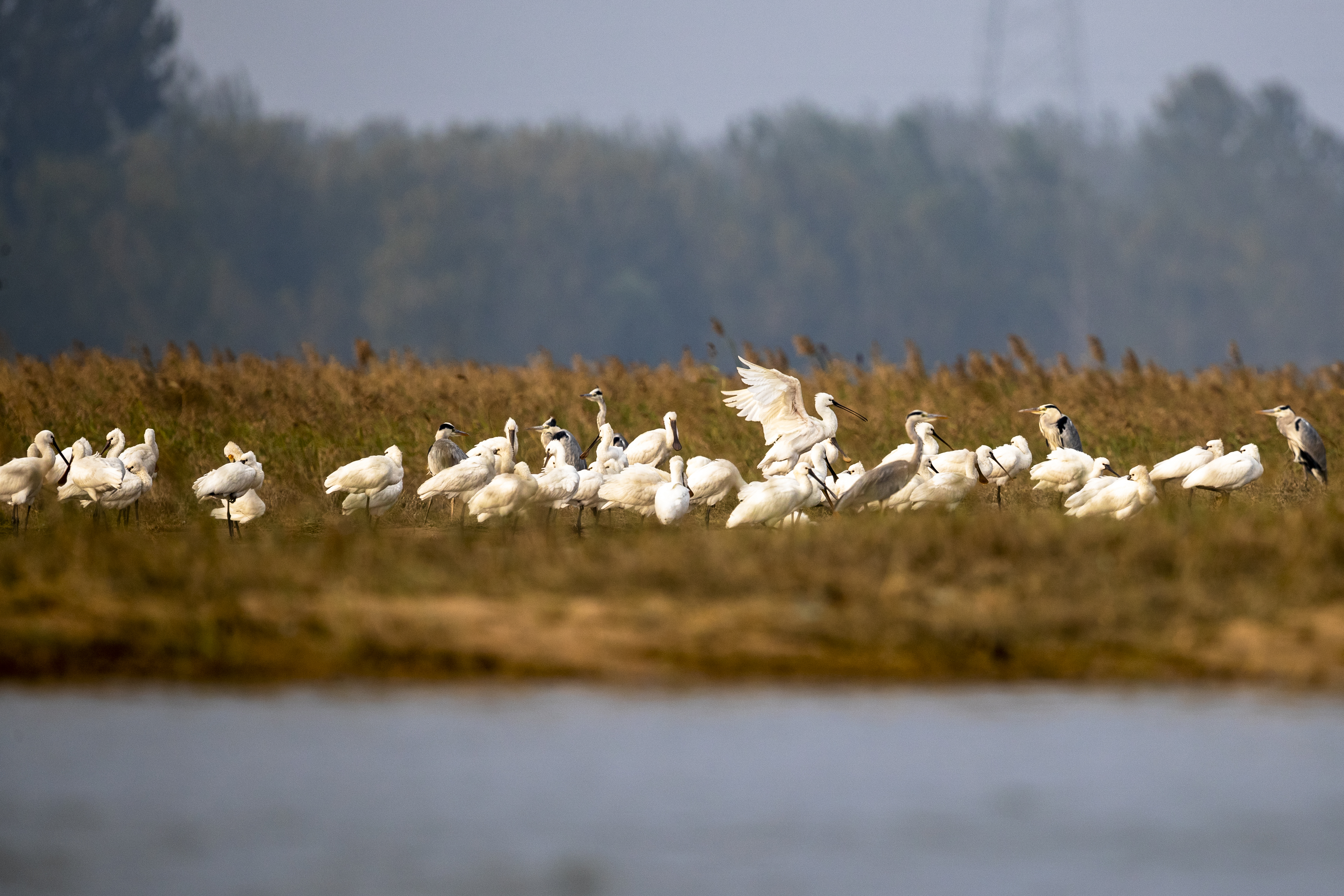 近日,60多只迁徙候鸟白琵鹭在沂河山东省临沂市郯城县段栖息,引来众多鸟类爱好者围观。