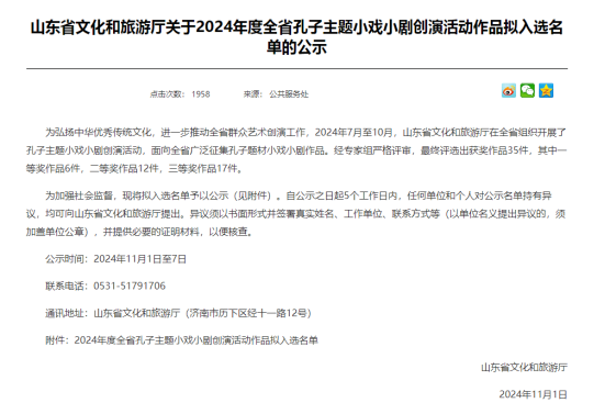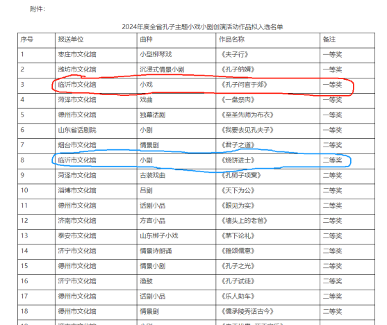 据了解,2024年7月至10月,山东省文旅厅在全省组织开展了孔子主题小戏小剧创演活动,面向全省广泛征集孔子题材小戏小剧作品。我县积极准备,在时间紧任务重的情况下,仍加紧创作,组织演员加班加点排练,最终向观众呈现了一台精彩绝伦的柳琴小戏作品。据了解,本次参赛作品经省专家组严格评审,最终评选出获奖作品35件,其中一等奖作品6件,二等奖作品12件,三等奖作品17件。