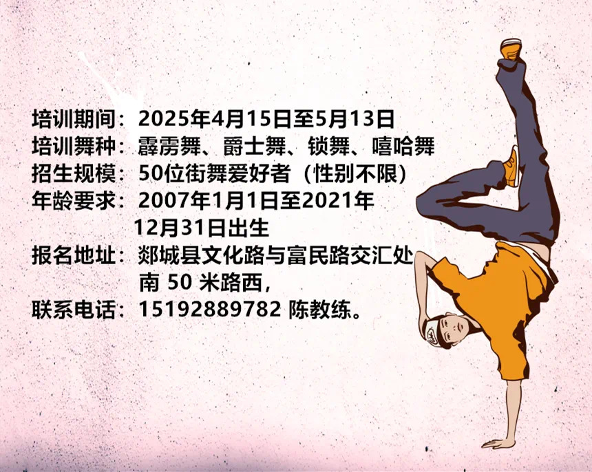 为全力夯实郯城县体育人才根基,以更饱满的竞技力量冲击省26届运动会,同时为临沂市九运会抢先挖掘后备人才,助力我县在霹雳舞项目上再创新高,郯城县街舞霹雳舞训练队特别筹备开办免费公益培训班。