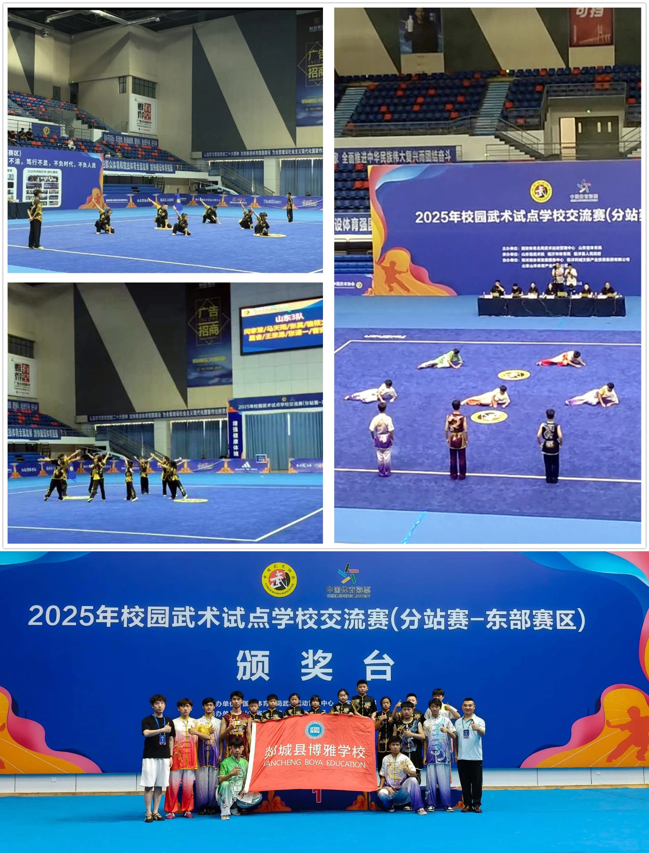 郯城县博雅学校的16名学生,历经2025年4月山东省U系列中小学生武术套路比赛的层层选拔,脱颖而出,代表山东省出征此次赛事。赛场上,小学组的同学们精神抖擞,一招一式刚劲有力,在集体长拳和集体基本功项目中,凭借整齐划一的动作、饱满昂扬的气势,一举斩获两个全国一等奖;中学组的队员们同样不甘示弱,在集体拳术项目中发挥出色,荣获全国二等奖。他们以扎实的武术功底、顽强的拼搏精神,生动诠释了博雅学子的卓越风采,也为山东赢得了荣誉。此外,教练员骆宏伟同志凭借出色的指导能力,荣获优秀指导教师奖,为此次参赛画上了圆满的句号。