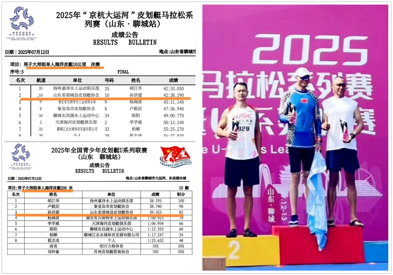 男子大师组的孙洪建同样展现了强大的竞争力。10公里赛道上,他与江南名将胡江华上演了巅峰对决,以0.05秒这近乎眨眼间的差距屈居亚军;转战200米赛场,他调整状态,奋勇拼搏,最终收获季军,每一次划桨都凝聚着他对胜利的渴望。