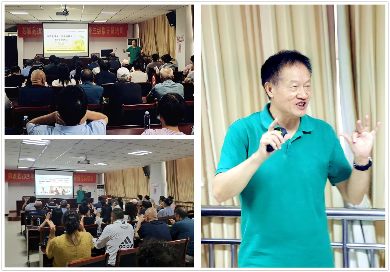 本次宣讲活动特邀曲阜师范大学体育科学学院的解毅飞教授担任主讲嘉宾。解毅飞教授在健康领域深耕多年,拥有深厚的学术造诣与丰富的实践经验。活动现场,解毅飞教授凭借其扎实的专业知识,创新性地提出了“体育生活化,生活中医化” 这一全新的健康理念。他指出,应将体育锻炼融入日常生活的点滴之中,同时巧妙结合中医养生智慧,从而全方位地促进民众的身体健康。此外,解毅飞教授还引入了独特的 “器官锻炼法”,为郯城县的健身骨干和体育指导员们开拓了全新的健身视野,让大家对科学健身有了更为深刻且新颖的认识。