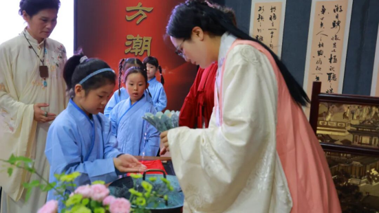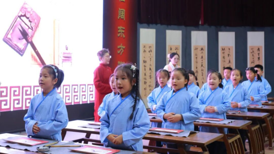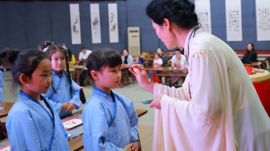学童们蘸水净心、整理衣冠,向师长与父母行礼致谢,在老师点朱砂“开天眼”、指导书写“人”字的过程中,体悟“先学做人、再学求知”的道理,也让家长对孩子的成材期许有了具象表达。