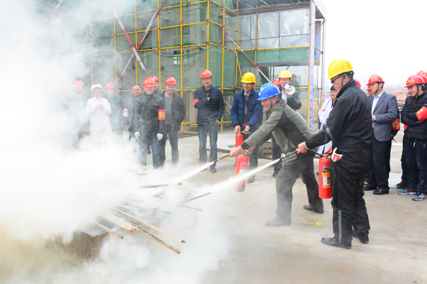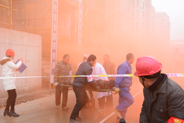 培训会后,与会人员在东方帝景施工现场,观摩了东方佳园建设集团组织的消防演练:火灾发生后,警报声此起彼伏,失事楼梯口冒出红色呛人浓烟,建筑工人不时从安全通道“逃出”,安全员迅速到达着火点,用灭火器、消防水枪现场灭火,消防车随即赶到,医疗救护队现场救治受伤工人,简单处理后由担架队快速运送到救护车,并送往医院… …