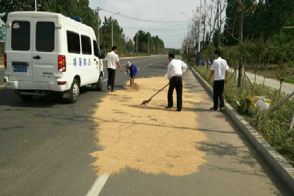当下,正是农忙时期,许多农户将收割后的麦子堆放在公路上进行晾晒,不仅影响市容市貌,还给过往车辆行人的正常通行造成了极大的安全隐患,极易引发交通事故。针对这一现象,县城管局执法大队积极组织执法力量深入城区主次干道对占道打场晒粮进行及时清理整治。