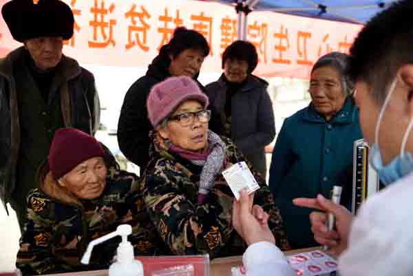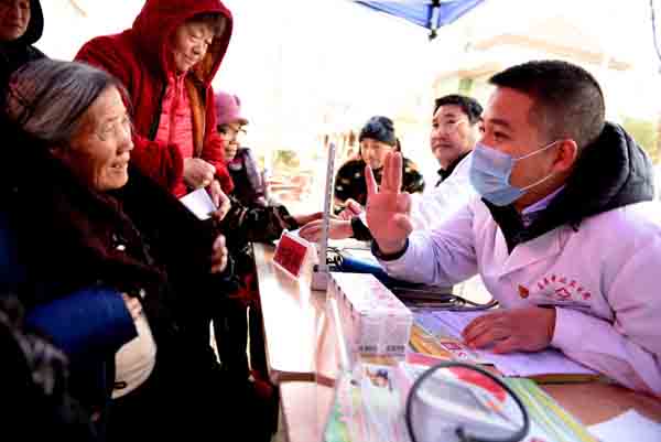2019年12月18日,在山东省临沂市郯城县马头镇马西社区桑庄村,健康扶贫医疗服务队向贫困群众发放免费药品。