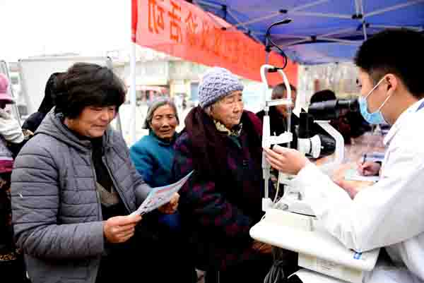 2019年12月18日,山东省临沂市郯城县健康扶贫医疗服务队在马头镇马西社区桑庄村为贫困群众免费检查眼疾。