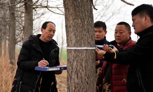 12月21日,山东省临沂市郯城县马头镇“三资”清理小组成员和竞标者在清点测量村民在集体土地上私自栽植的树木。
