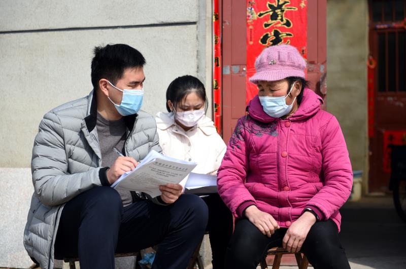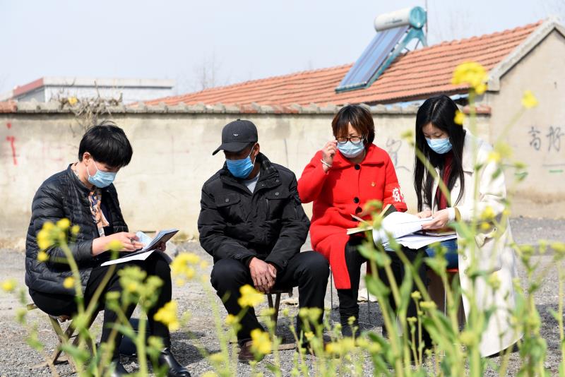 3月12日,郯城县马头镇工作人员向圩东村贫困户杜培梅(右一)了解核实相关信息。