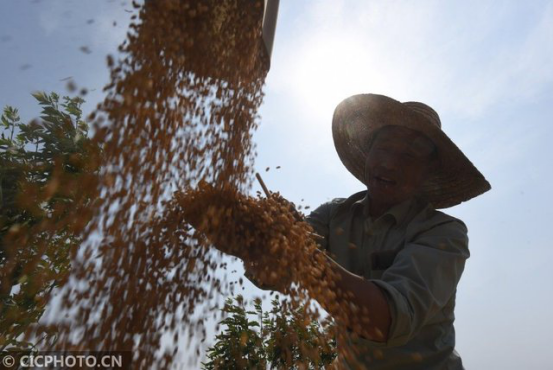 2020年6月8日,山东省临沂市郯城县马头镇“种粮大户”赵文争和家庭农场工人将收获的小麦扬净入库。CICPHOTO/房德华 摄