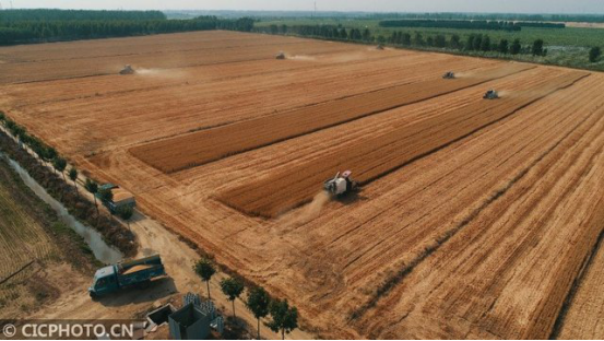 2020年6月8日,在山东省临沂市郯城县马头镇,几台收割机在“种粮大户”赵文争的小麦田里作业。(无人机照片)CICPHOTO/房德华 摄