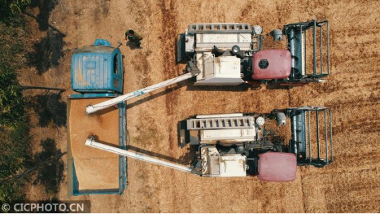2020年6月8日,山东省临沂市郯城县马头镇“种粮大户”赵文争将收获的小麦晾晒入库。(无人机照片)CICPHOTO/房德华 摄