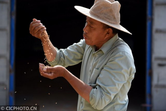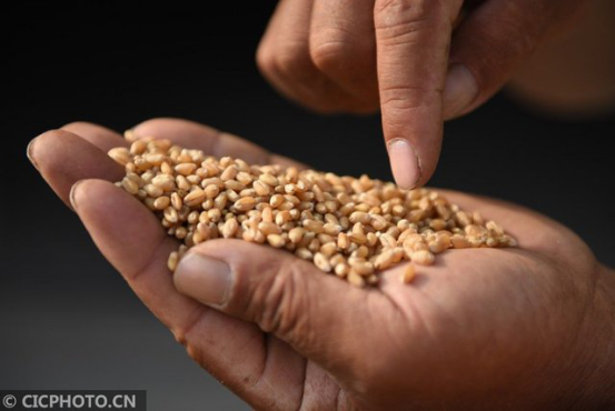 2020年6月8日,山东省临沂市郯城县马头镇“种粮大户”赵文争在查看新收获的小麦。CICPHOTO/房德华 摄
