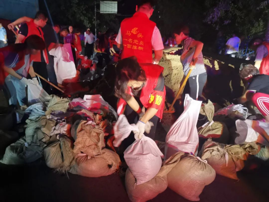 在马头镇拦河闸抗洪一线,党员干部、志愿者、群众积极填挖抢险物料,争分夺秒的投入到抗洪抢险中来。他们,有的手抬,有的肩抗。他们,有的稚气未脱,有的年过花甲。他们,用汗水在大堤上点亮志愿之光,只为一个共同的使命:保卫家园。(马头镇供稿)