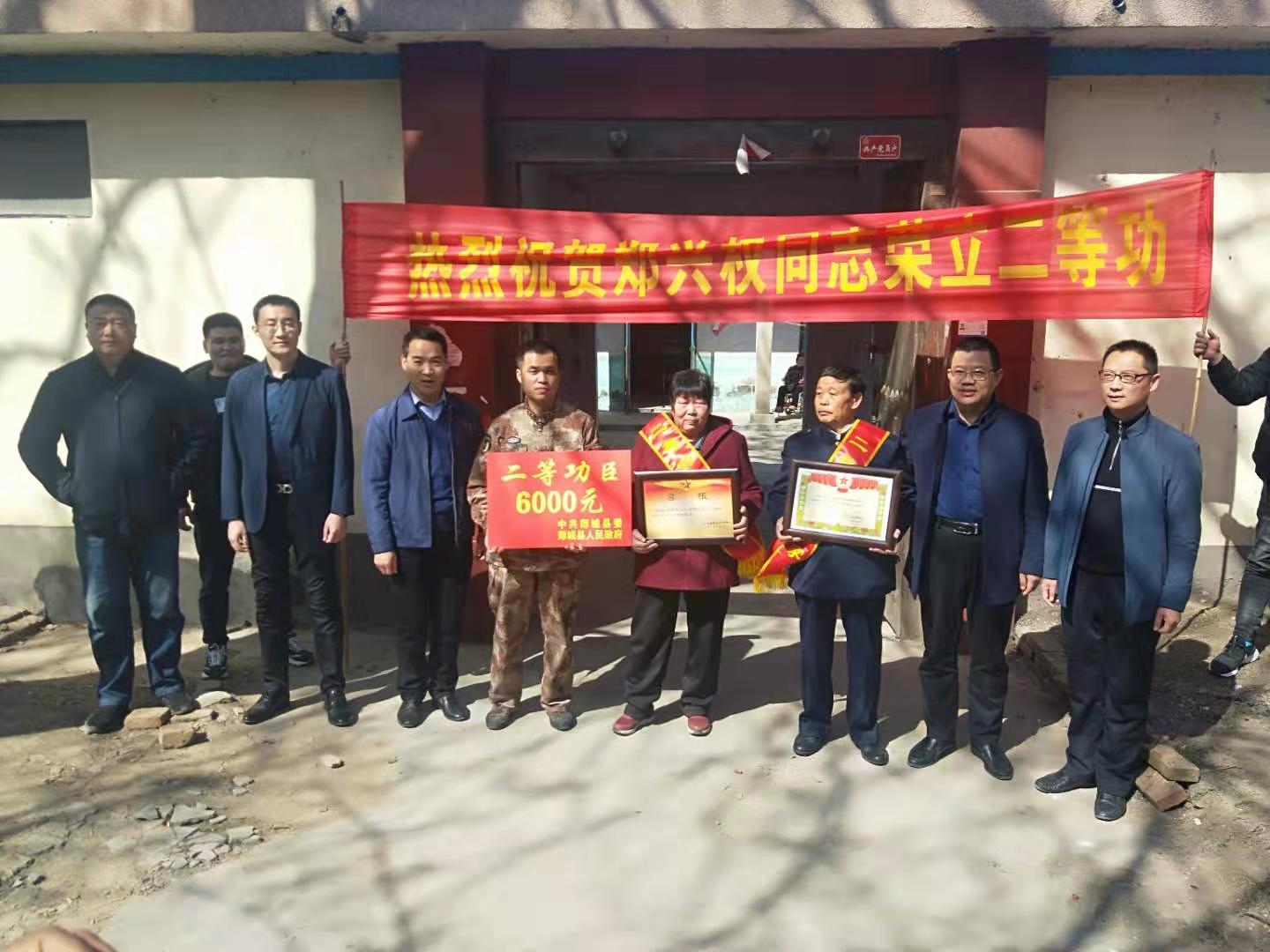 3月22日下午,郯城街道北关一村郑兴权家锣鼓喧天、鞭炮齐鸣。县人武部、县退役军人事务局和郯城街道领导齐聚小院,在热烈祝贺他再次荣立二等功的同时,军地领导还为其父母披上“二等功臣家属”荣誉绶带,并送去慰问金6000元。