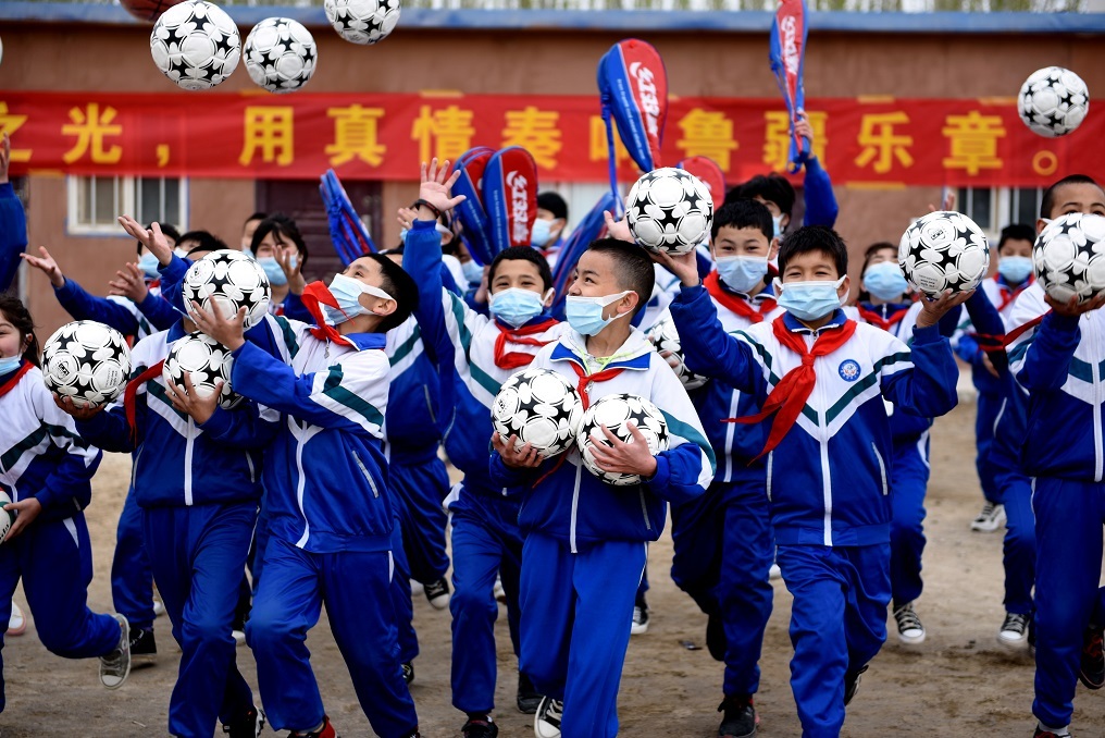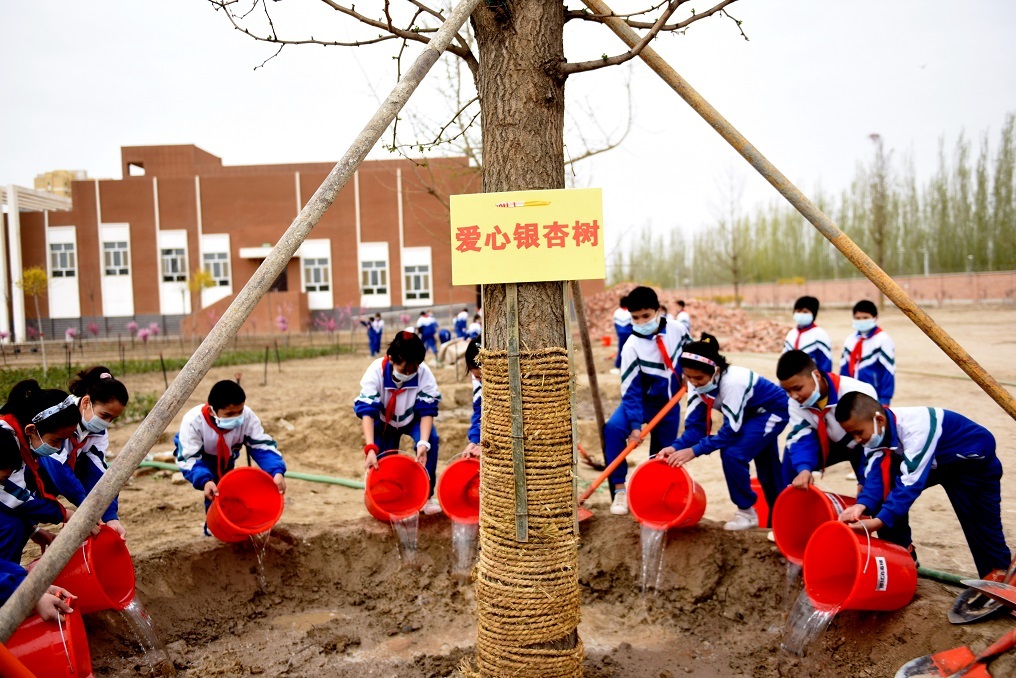 在新疆喀什麦盖提县第四中学,学生们正栽植山东郯城罗荣桓红军小学赠送的“爱心银杏树”。孩子们同时还获得了来自郯城县价值30余万元的体育器材和700多个“爱心大礼包”。