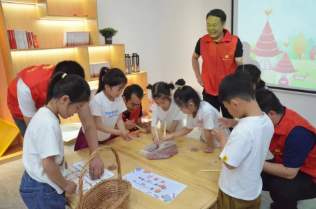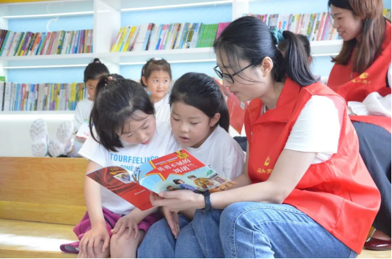 孩子们将作品赠送给现场的各位“大朋友”,“大朋友”回赠节日礼物红色绘本。志愿者们伴读红色绘本,用红色文化点燃童心梦想,浸润金色童年。