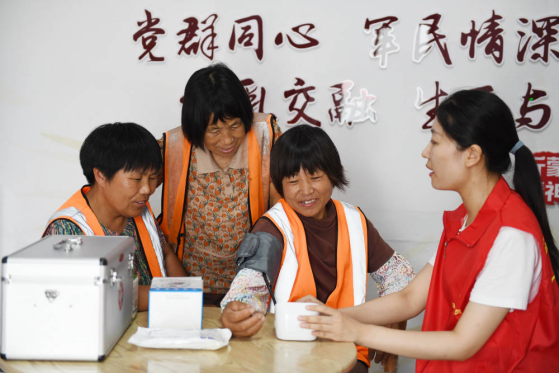 7月6日,在马头镇“为民服务站”,值班人员为环卫工人测量血压。