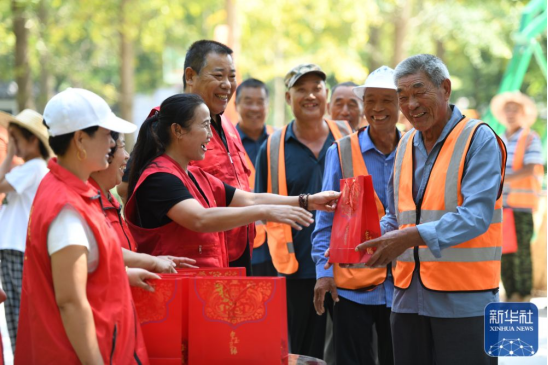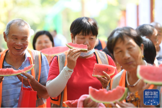 当日进入末伏,在山东省临沂市郯城县马头镇,爱心人士带着西瓜、毛巾、遮阳伞等遮阳消暑用品,为环卫、绿化等户外劳动者送清凉。