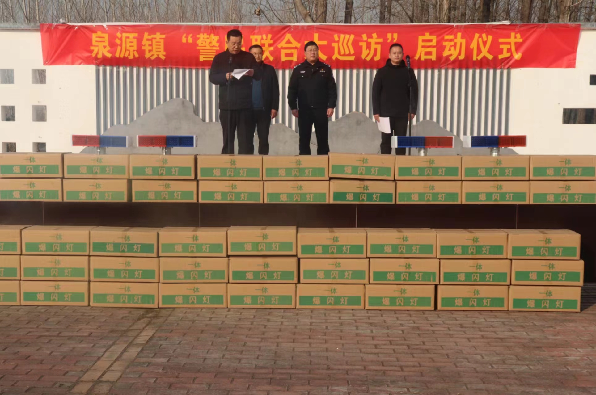 1月26日,泉源镇在五湖社区举办“警民联合大巡防”启动仪式。在启动仪式上,对警民联合大巡防工作进行部署动员,实现网格化巡防全覆盖,并将新购置的100台一体式爆闪警灯全部配发给60个自然村。