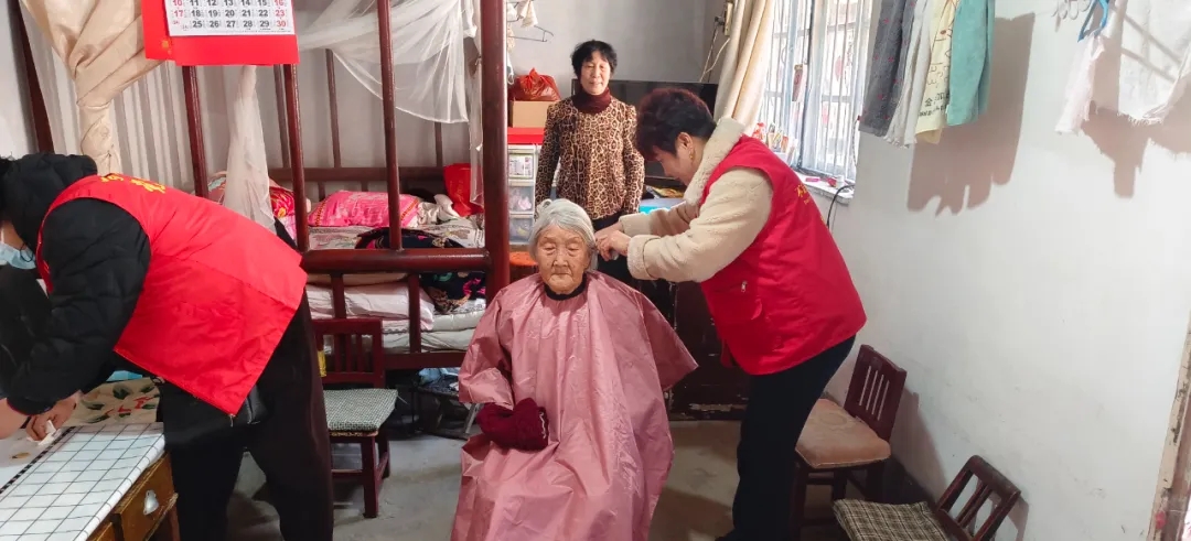 社区妇联和巾帼志愿者来到了百岁老人朱德英家,平日里安静的家因巾帼志愿者的到来增添了活力和热闹,志愿者们一来到就开始打扫起了卫生,屋里院外,客厅厨房每一处都打扫的干干净净,大家询问老人的身体健康状况和精神状态,细致了解老人的日常生活需求,叮嘱老人注意防寒保暖,保重身体。看到老人的头发有点长了,志愿者们又找来工具帮老人剪头,老人笑呵呵的说:“我的头发从来没有花过钱,都是你们帮我剪得,还剪的那么好。”最后,志愿者们纷纷留下自己的联系方式,让独居老人、空巢老人有需要时随时打电话。
