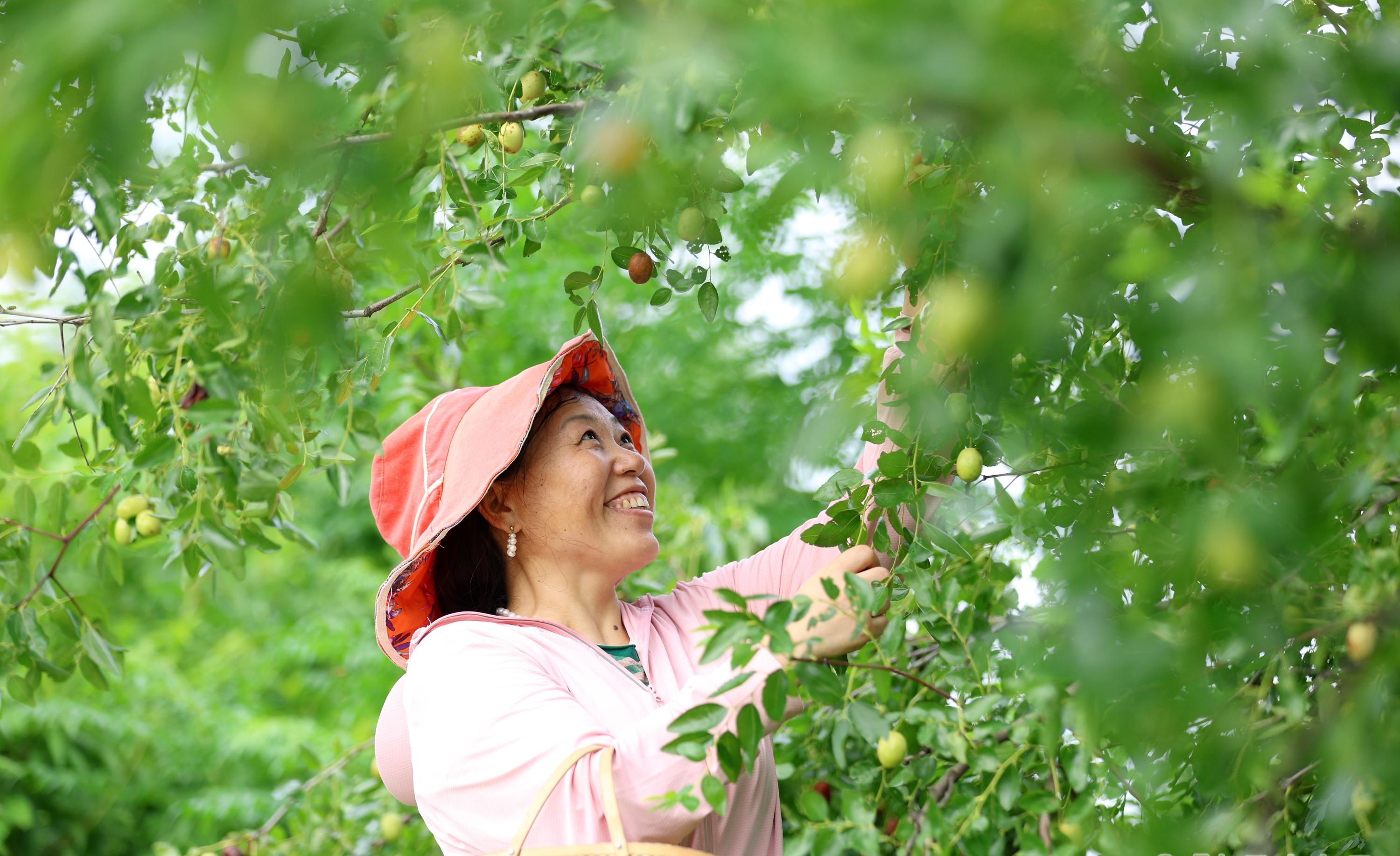 郯城县郯城街道穆柯寨村村民正在采摘大菱枣。