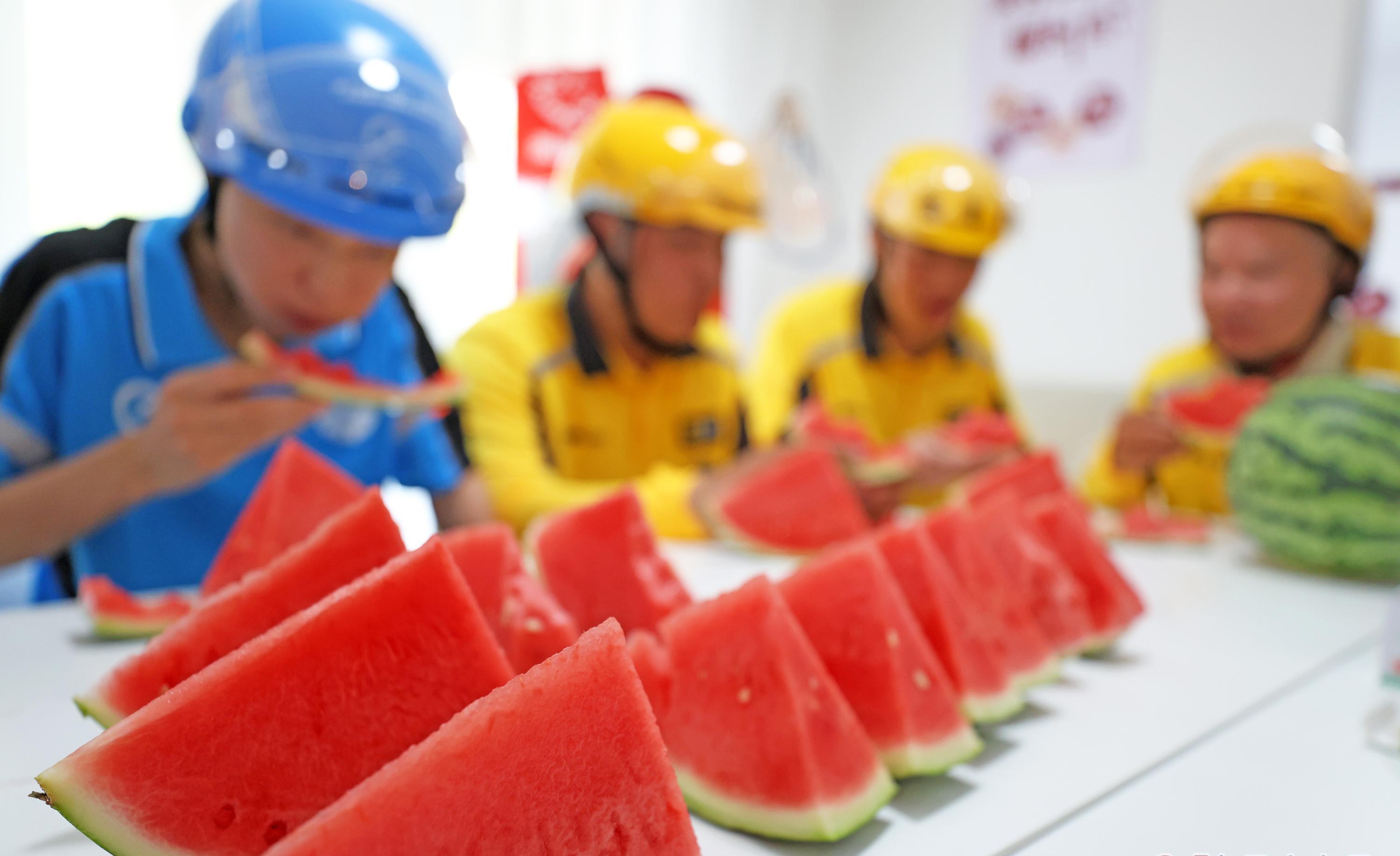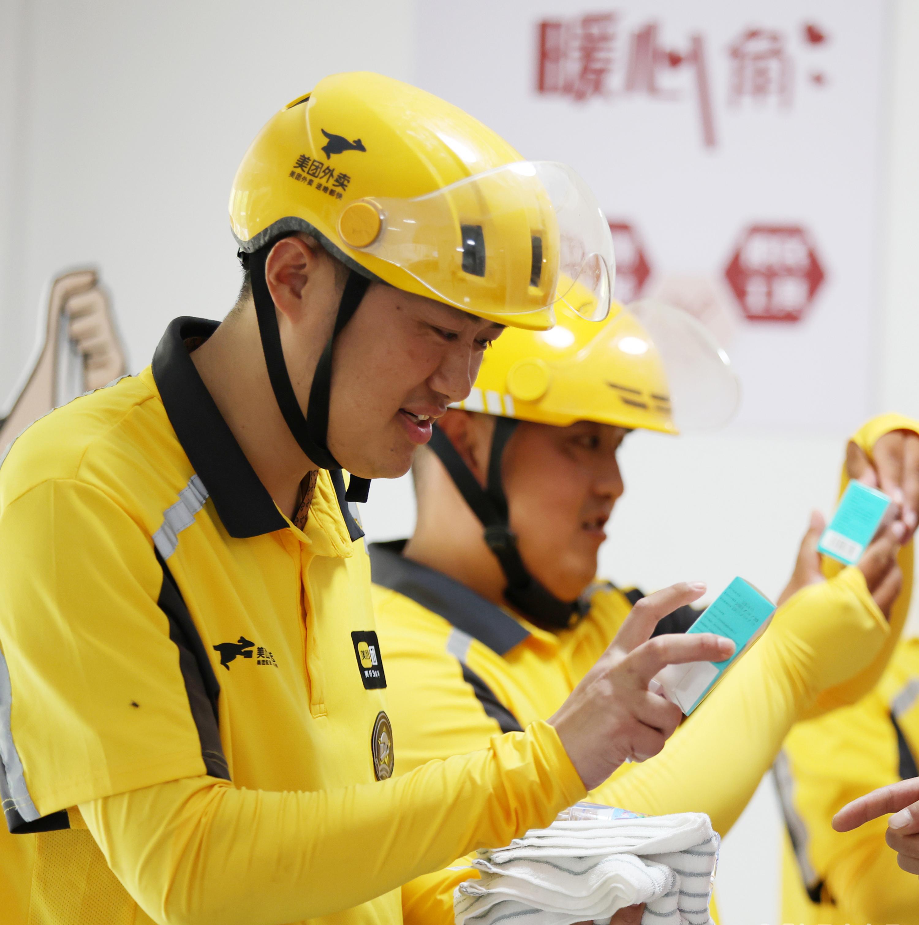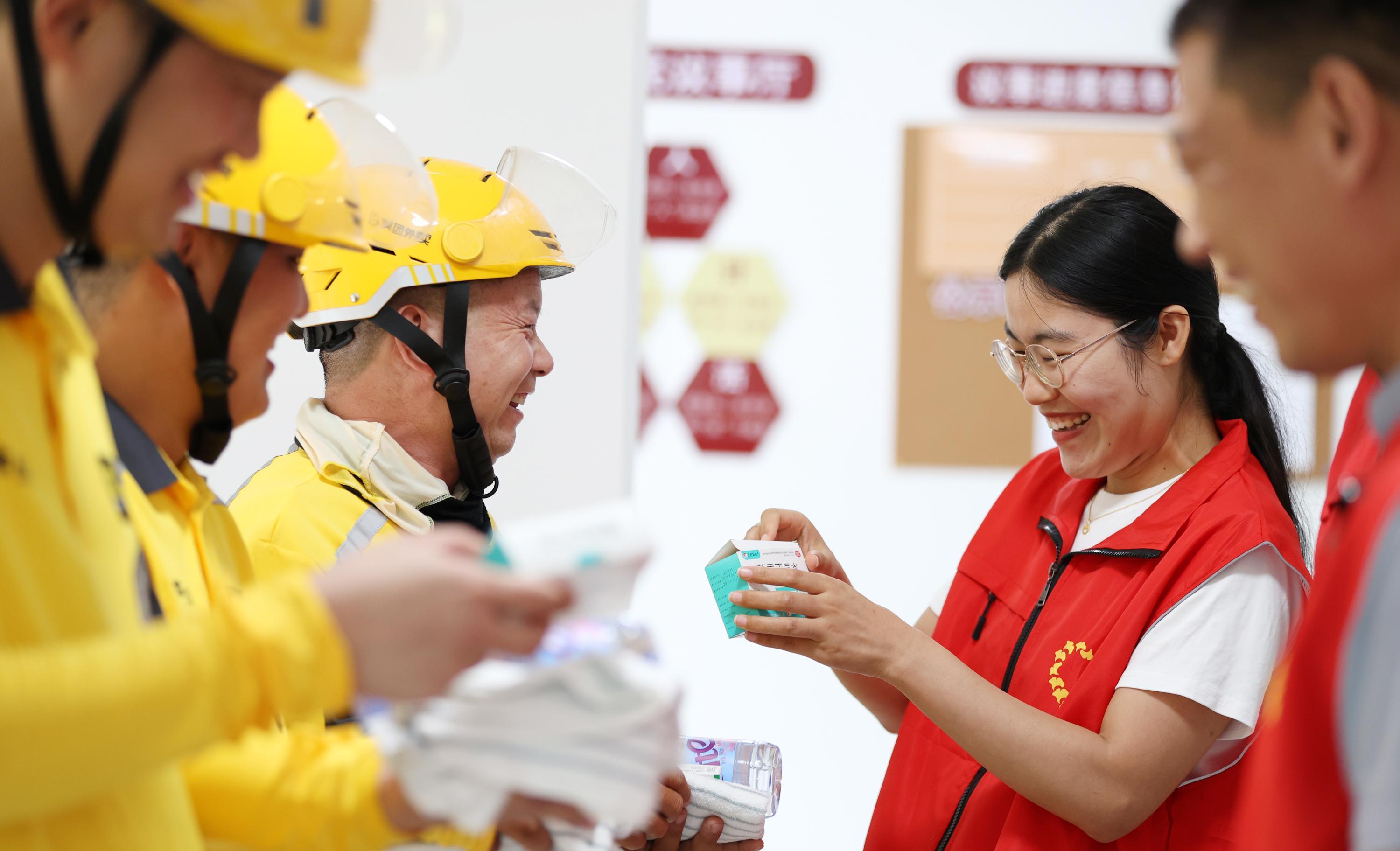 6月21日,在临沂市郯城县郯城街道府东社区“暖蜂驿站”,社区工作者为外卖配送员送上藿香正气水、毛中等防暑物品,郯城县郯城街道组织社区工作者开展志愿服务,为户外劳动者献爱心,做好防暑降温,确保高温下户外劳动者的安全。