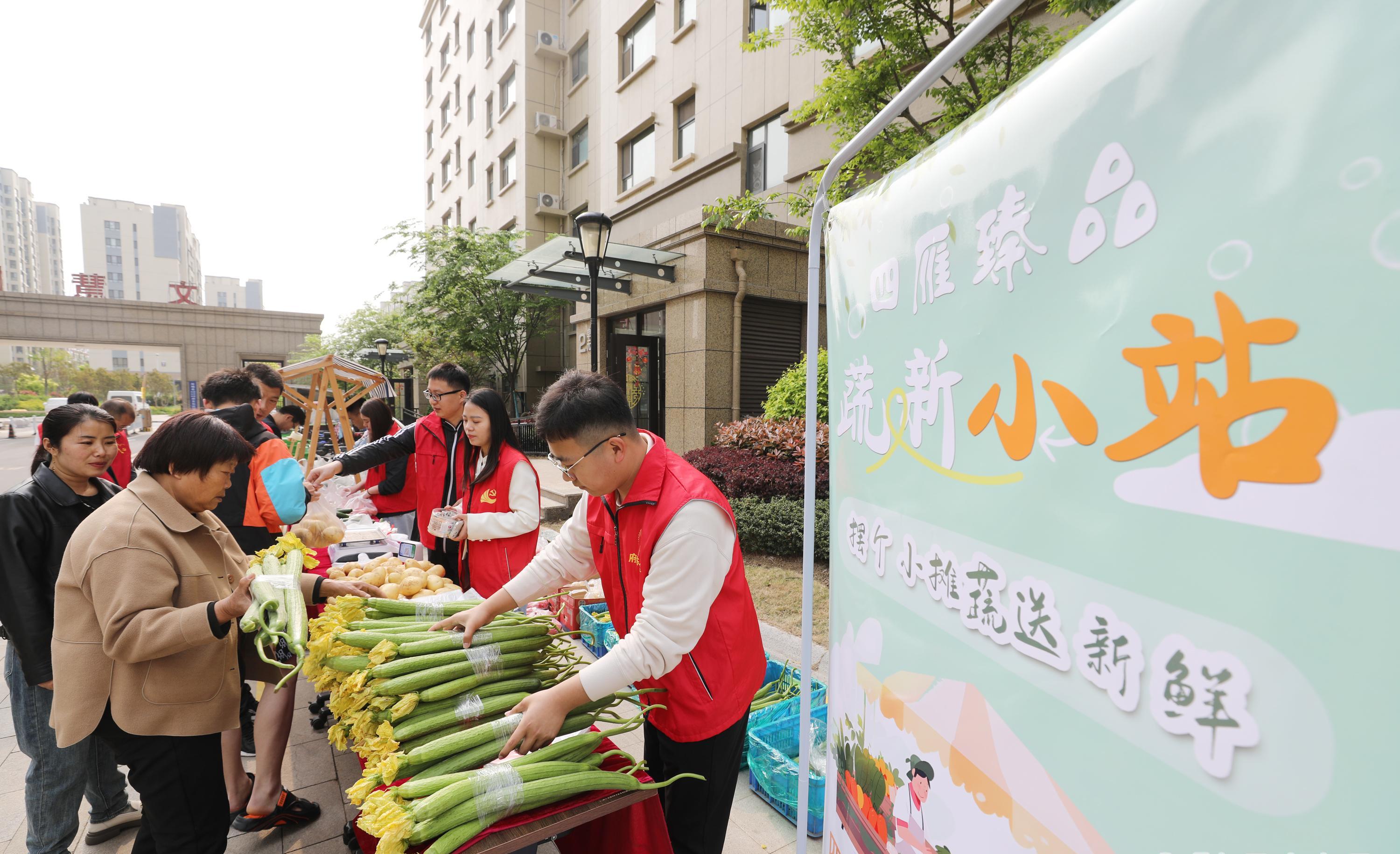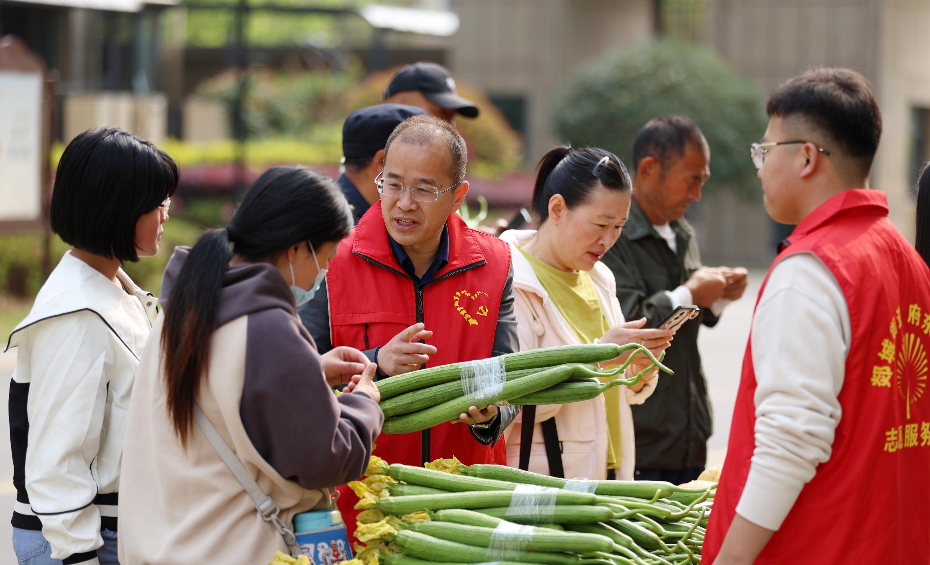 4月21日,在山东省临沂市郯城县郯城街道府东社区,居民在“助农大集”上选购新鲜蔬菜