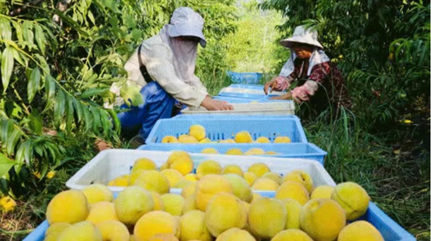连日来,泉源镇马陵山黄桃种植基地迎来采摘季。郁郁葱葱的桃林间,沉甸甸的黄桃压弯枝头,果农们穿梭其间,忙着摘果、运果、装箱,一派繁忙丰收景象。