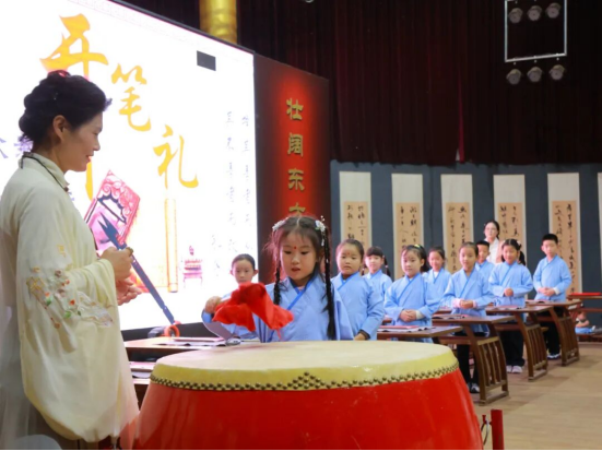 学童们蘸水净心、整理衣冠,向师长与父母行礼致谢,在老师点朱砂“开天眼”、指导书写“人”字的过程中,体悟“先学做人、再学求知”的道理,也让家长对孩子的成材期许有了具象表达。
