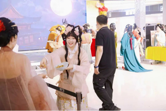 活动当晚,身着汉服的参与者们衣袂翩跹。香案上整齐地摆放月饼、水果等供品,参与者们有序肃立,依次行拜礼,在庄重的仪式感中祈求阖家团圆、国泰民安,最后共同分享供品,延续“团圆共食”的传统寓意。拜月仪式不仅还原了从先秦秋祭演变而来、历经唐宋普及、明清规范的传统习俗,更让现场观众直观感受到中华礼文化的深厚底蕴。