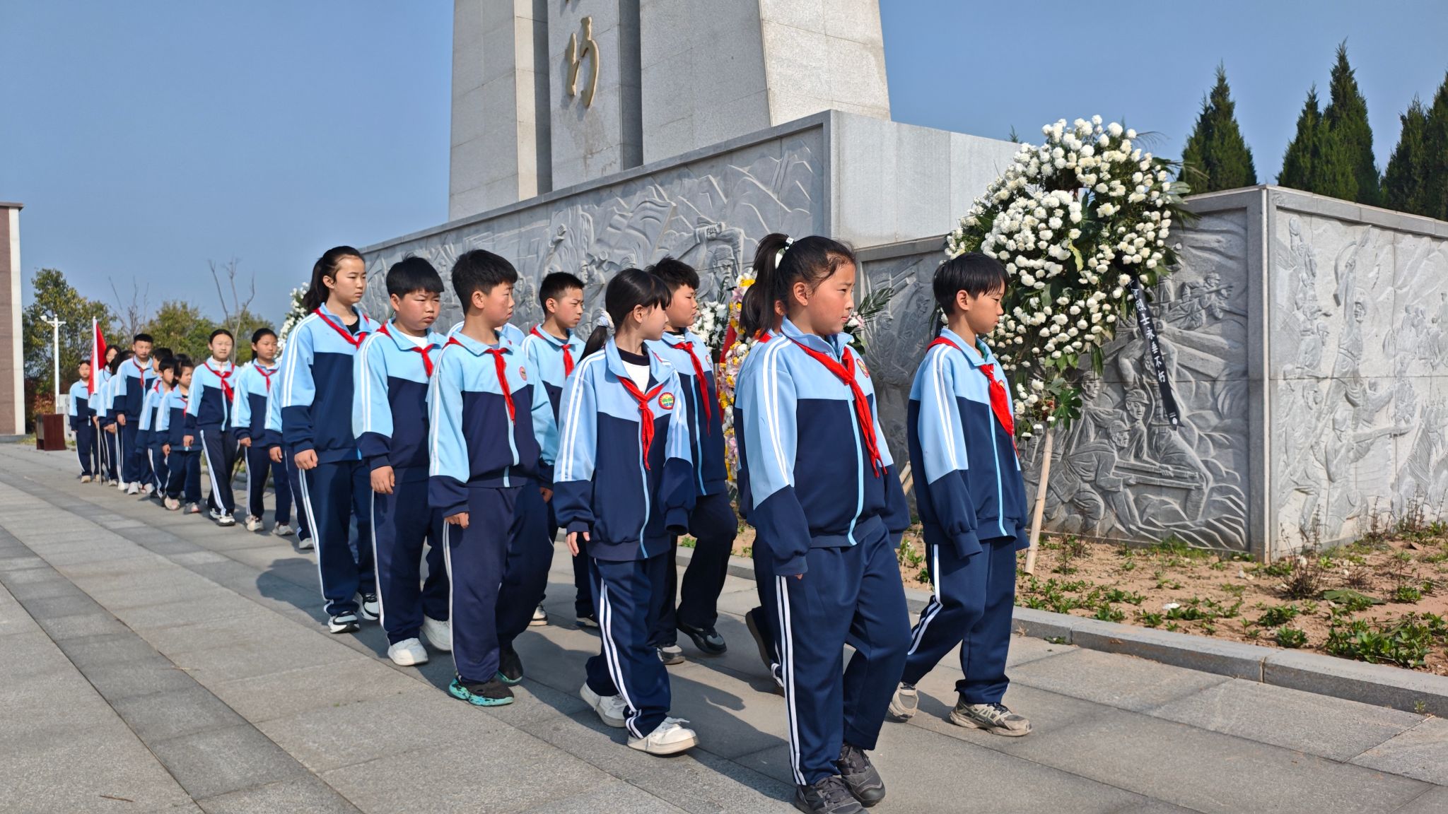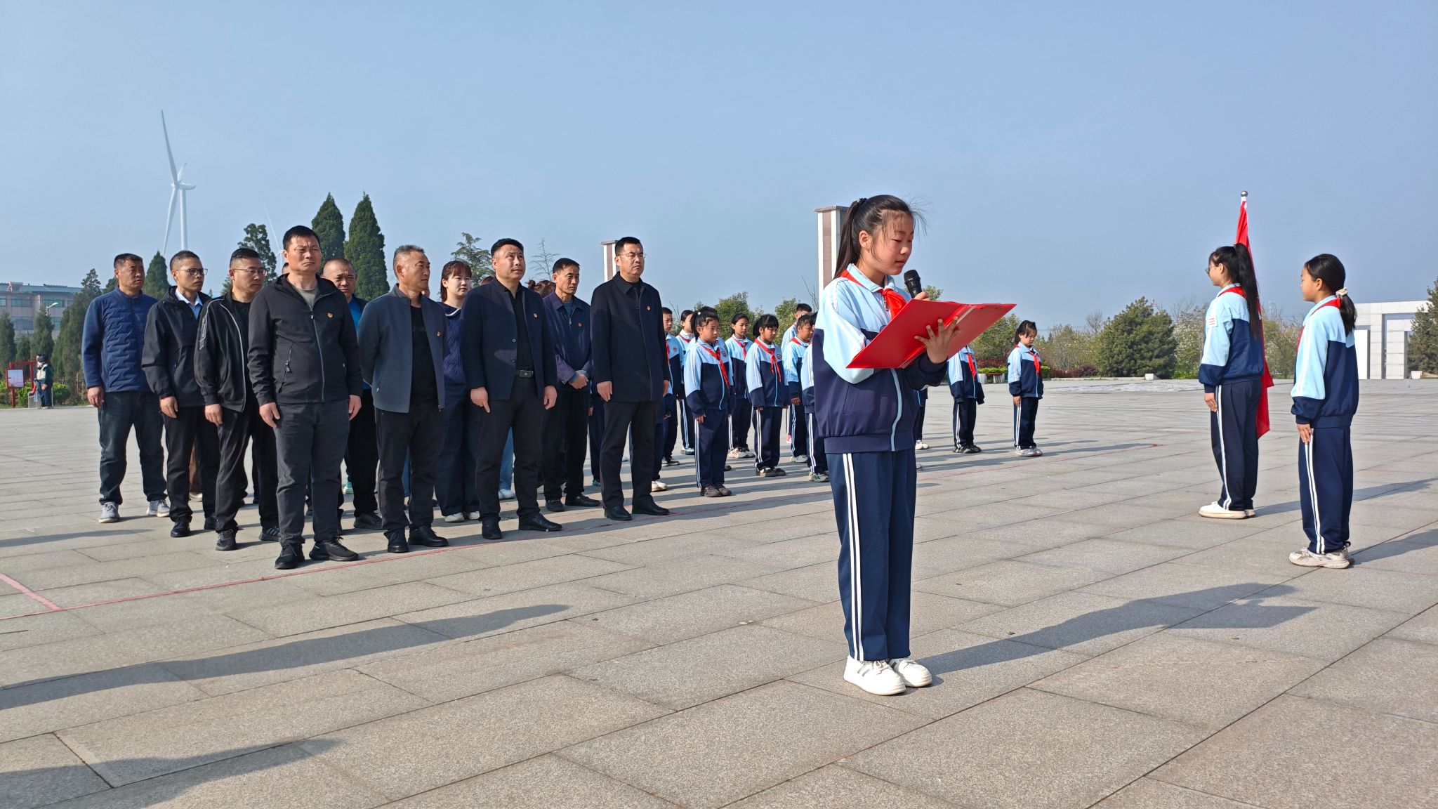 活动现场,全体师生肃立在革命烈士纪念碑前,奏唱国歌、敬献花圈,向先烈默哀致敬。少先队员代表整齐列队,献上洁白鲜花,重温入队誓词,许下"请党放心、强国有我"的誓言。