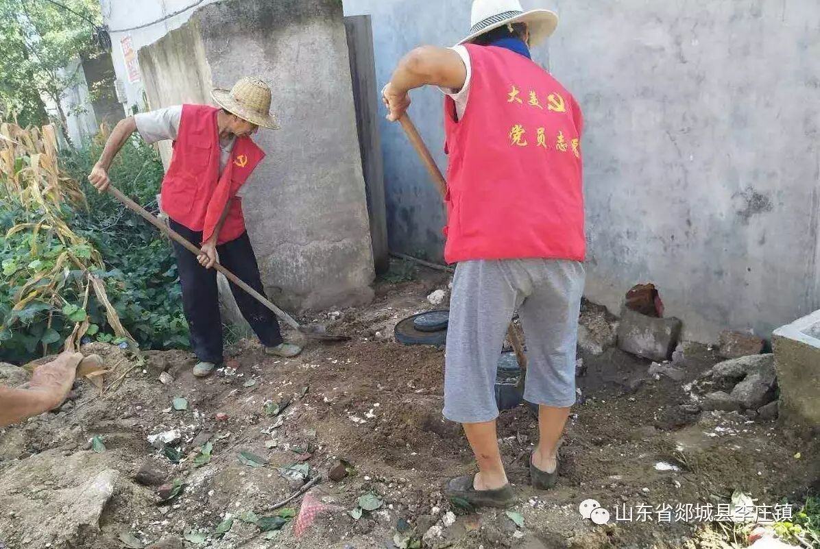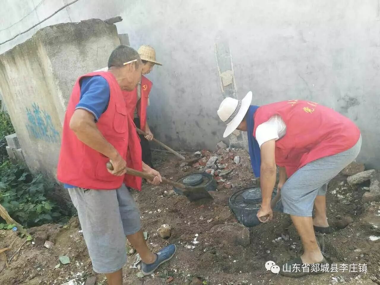 在改厕现场,五六个党员使出浑身解数,把1立方米、30斤沉的蓄粪桶稳稳当当得放入挖好的坑道里......忙活了近3个小时,终于把一套完整的卫生厕所改造完成了。