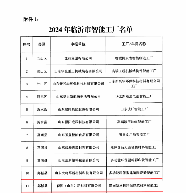 3月12日,临沂市工业和信息化局发布了《关于公布2024年度临沂市智能工厂和数字化车间名单的通知》,我县山东大将军新材料有限公司、森固新材料(山东)有限公司2家企业成功申报市级智能工厂,山东合创新材料有限公司、万华禾香板业(临沂)有限公司、山东建荣教学设备有限公司、山东三佳聚合高分子材料有限公司4家企业成功申报市级数字化车间。
