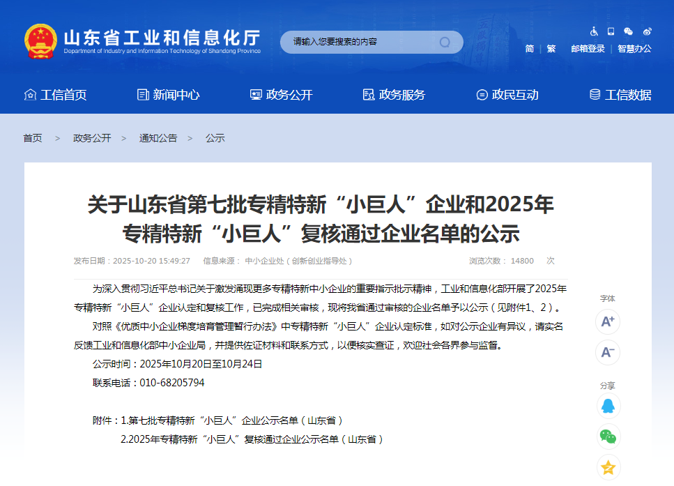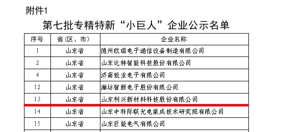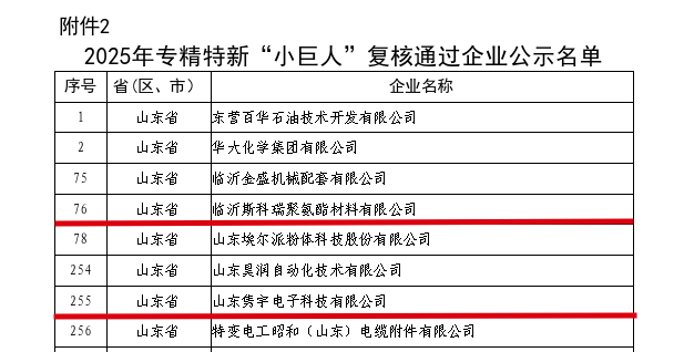 10月20日,山东省工业和信息化厅发布了《关于山东省第七批专精特新“小巨人”企业和2025年专精特新“小巨人”复核通过企业名单的公示》,我县山东利兴新材料科技股份有限公司成功入选第七批专精特新“小巨人”企业名单,临沂斯科瑞聚氨酯材料有限公司、山东隽宇电子科技有限公司顺利通过2025年专精特新“小巨人”企业复核。