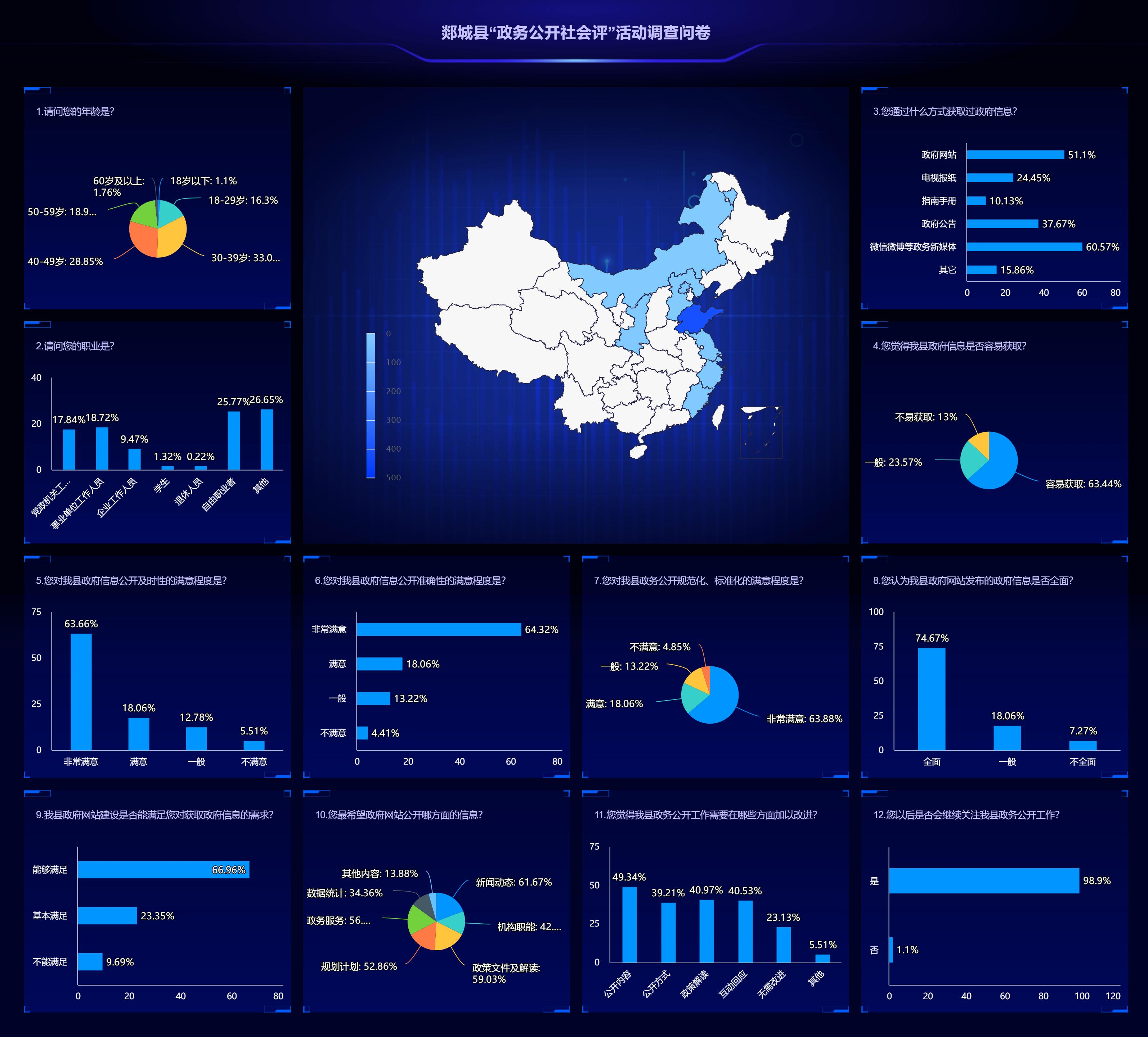 线上征集和线下调查于5月11日开始,通过在县政府网站及各级各部门政务新媒体发布调查问卷、在县政务服务大厅及各乡镇便民服务中心设置易拉宝2种途径,开展政务公开社会评活动。活动期间,共回收调查问卷454份,年龄集中在30-50岁,主要职业是自由职业者和其他职业。经分析,63.44%认为郯城县政府信息容易获取,81.72%对政府信息公开的及时性满意,82.38%对政府信息公开的准确性满意,61.67%最希望政府网站公开新闻动态类信息、59.03%希望公开政策文件及解读信息、56.39%希望公开政务服务信息,66.96%认为政府网站建设能够满足自身获取政府信息的需求。