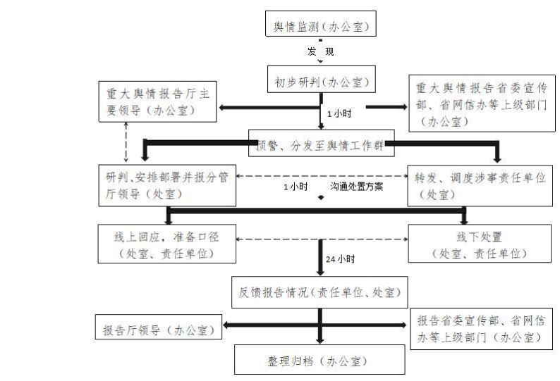 8.3.1舆情分发:办公室经研判需要预警的舆情,在1小时内发送到局“舆情微信工作群”,局各舆情责任主体1小时内转发和安排部署给涉事责任单位,指导涉事责任单位成立相应工作小组,立即开展线下调查、处置等工作。
